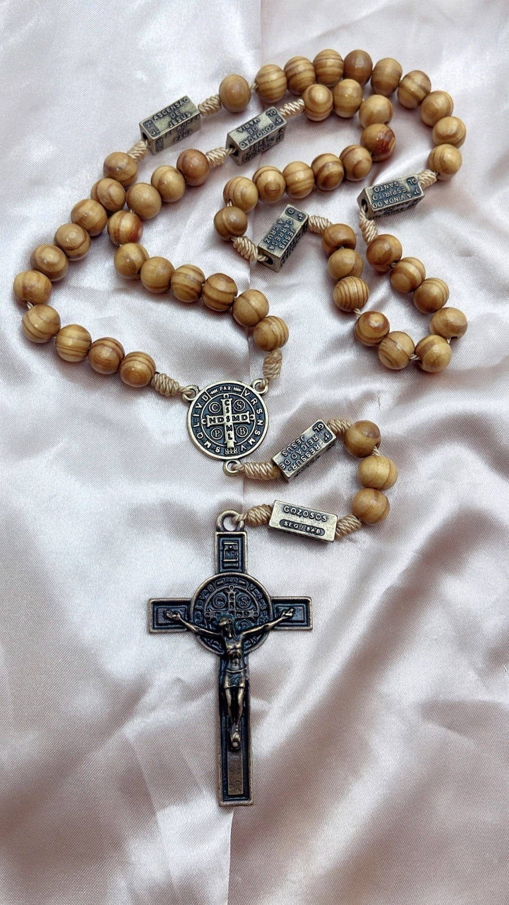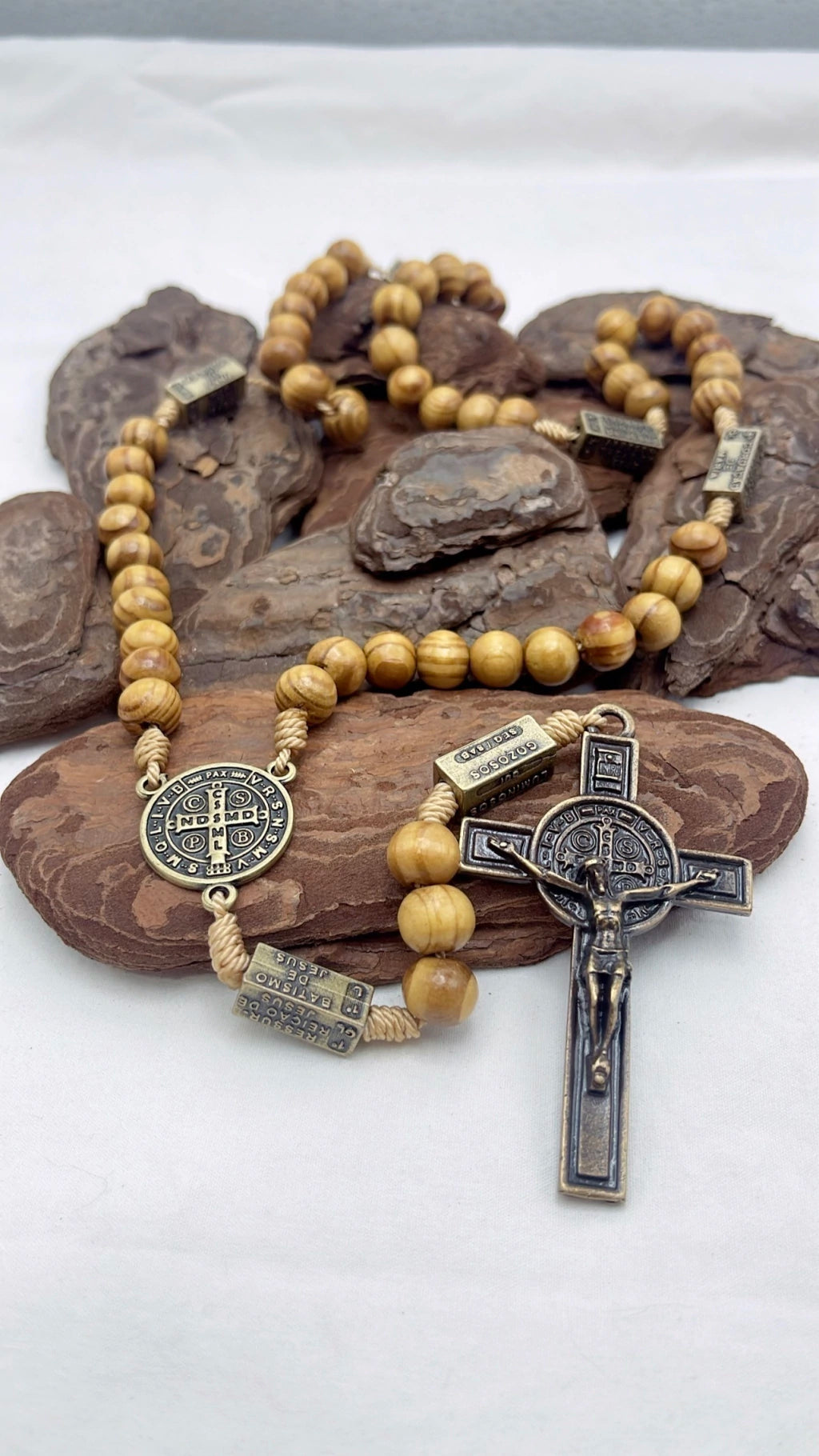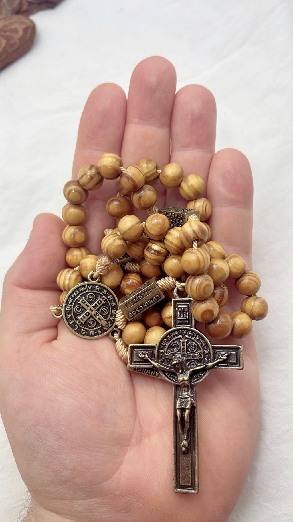 🔸Crucifixo de São Bentoem metal envelhecido, com detalhes em alto-relevo; 🔸 Medalha de São Bento central, símbolo de proteção espiritual; 🔸 Contas grandes de 10mm em madeira rajada, polidas e resistentes, entrelaçadas com cordão de algodão cru; 🔸 Divisores metálicos com os Mistérios do Rosário gravados: Gozosos, Dolorosos, Gloriosos e Luminosos; 🔸 Feito à mão com materiais de alta qualidade e acabamento refinado.