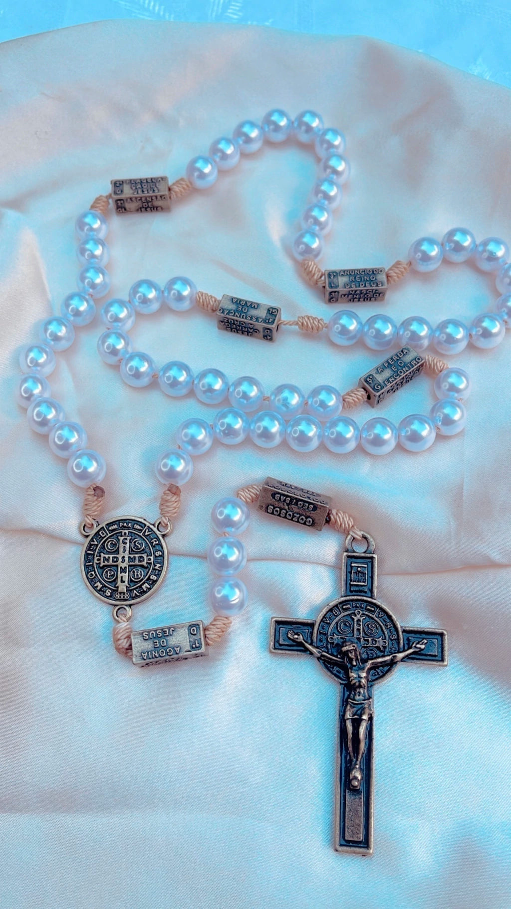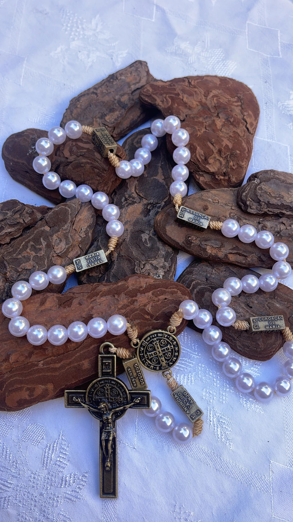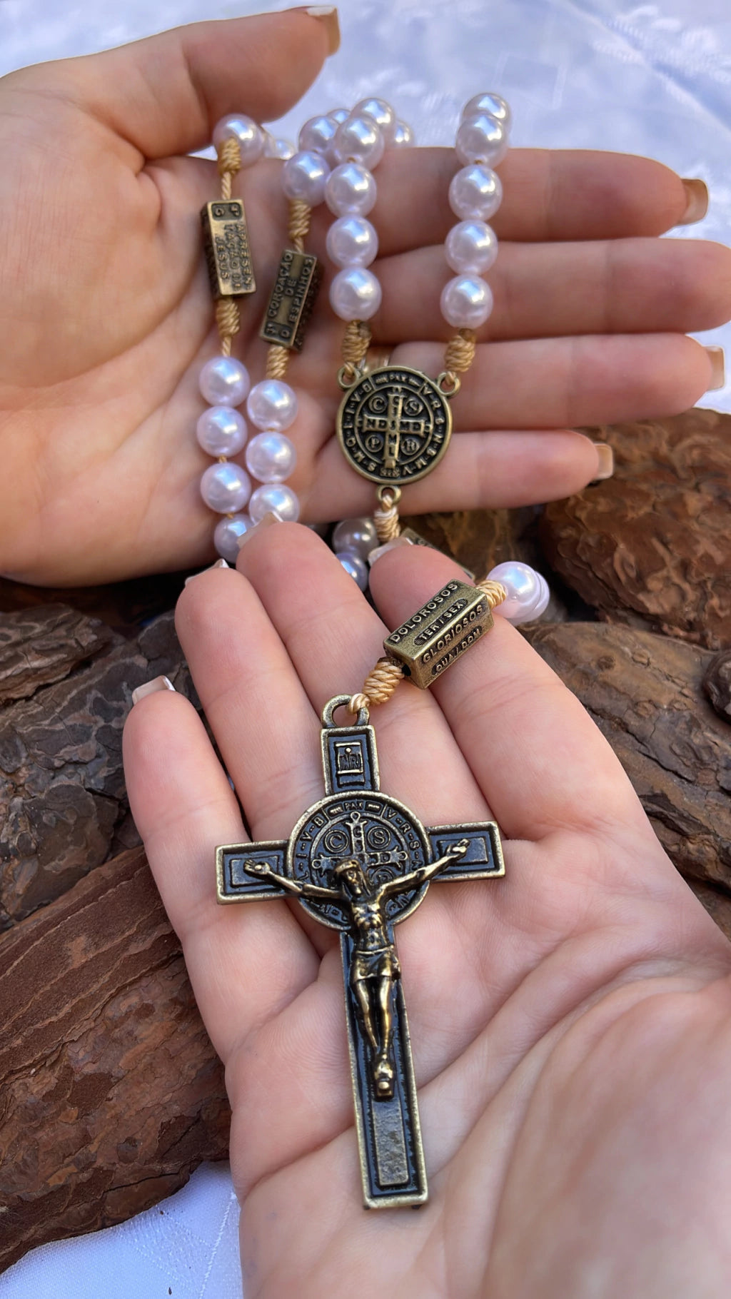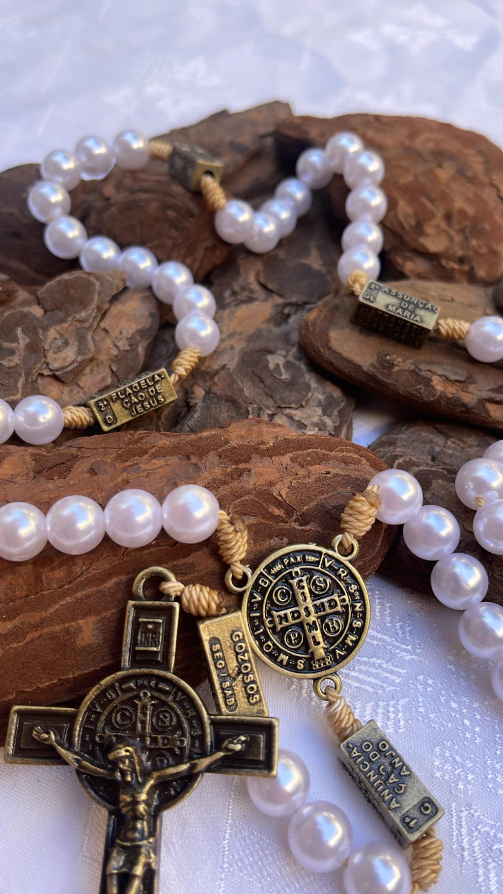 Terço dos Mistérios do Rosário – Pérola ABS Branca 10mm | Cruz e Medalha de São Bento em Ouro Envelhecido